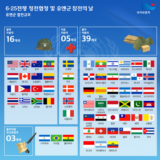 전쟁 발발 당시 독립국가 93개국 중 - 63개국이 남침 당한 한국을 지원